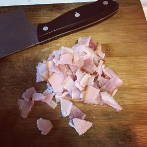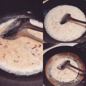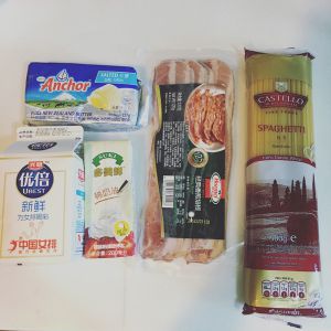 倒入牛奶和淡奶油,在培根之上,多一点。待吸收到一半,倒入面。这一步里可以加盐,以免面不够咸。