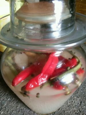 烧适量开水晾凉,倒入泡菜坛子,放入盐冰糖适量,放入准备好的老姜片,蒜瓣,花椒,(这儿忘拍照了)