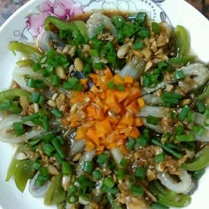 趁热把调好的酱汁倒在上面,最后撒上葱花
