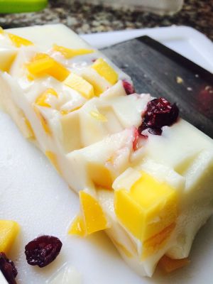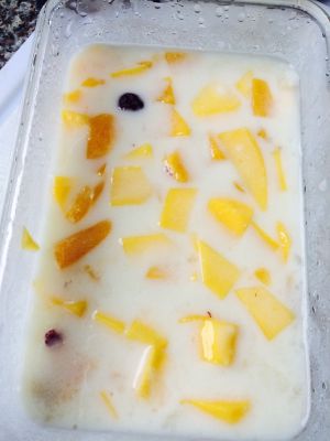 冷却至不烫手,倒入保鲜盒,加入切碎的芒果和蔓越梅干,搅拌,放冰箱冷藏一夜。