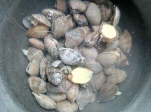 锅中加水煮开,倒入适量料酒,几片姜,倒入蛤蜊煮至张口捞出。
