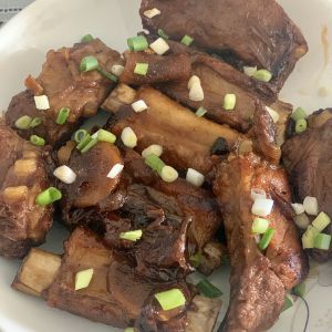 装盘撒上我钟爱的小香葱点缀,香喷喷的红烧排骨就做好啦。