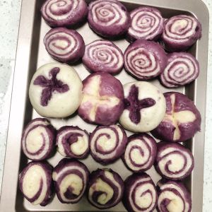 *紫薯差不多也蒸好了,取出紫薯等紫薯稍凉,戴上手套把捏碎,加入适量牛奶、在加2g酵母(温度不能太高,酵母会失去活性),加入100g面粉,揉成不粘手的面团(牛奶可以适量调整)