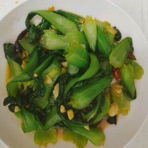 放入底油 热锅凉油便加入辣椒段,随后加入葱蒜,出香味加入小油菜,随即加入盐,味精。翻炒出汁水后加蚝油。翻炒均匀