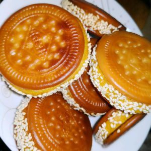 将拌好的糯米粉南瓜馅夹在2片饼干之间,厚度大约1.5厘米,边缘粘上芝麻,全部夹好后再开始炸