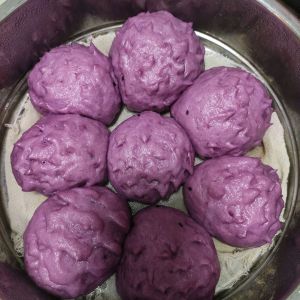 发酵的时候,忘了还有这个馒头要做,发的久了点,发了三倍大,拿出来手工揉面,可能是加了紫薯,面团很绵软,手感不错。(附图不是同一次的,就是给看个没熟之前的大小)