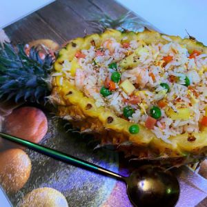 最后加入菠萝丁翻炒出菠萝的香味就可以关火出锅啦!