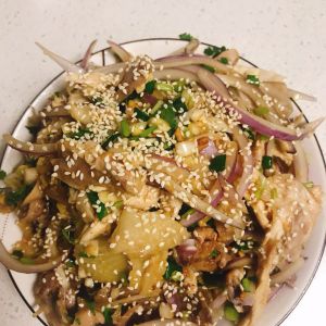 忽略残暴的骨肉分离的拆肉过程,把鸡全部撕成小块,加入以上所有配菜和调味料,搅拌再搅拌。又忘了拍照