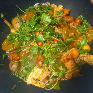 出锅前加入芝麻香菜和小米辣点缀。