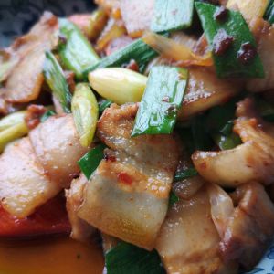 锅热,倒油,加入煮好的五花肉中小伙煸香,加入备好的大蒜叶,大蒜子,大红椒翻炒,再加入豆瓣酱,盐和酱油煸炒。注意豆瓣酱是带盐味的,所以加盐的时候别太多了。
