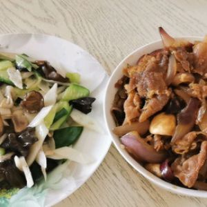 另起锅,加入少量油,炒洋葱。有香味后加入肥牛,翻炒均匀