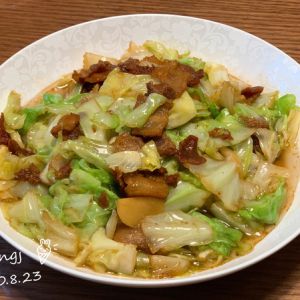 1:包菜去心撕片,肉切片,姜 蒜切片