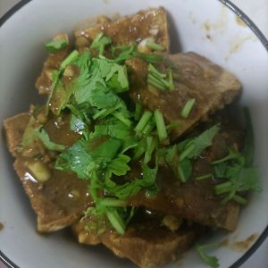 最后一步调汤汁,芝麻酱 生抽 辣椒油 孜然粉 葱花 蒜末,两块臭豆腐按成泥和汁调一起,最后撒上香菜,搞定 又臭又长香味道美美哒