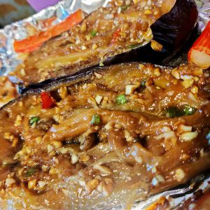 拿出烤箱中烤好的茄子,一切为二,均匀的倒上酱汁,再次放入烤箱,210度上下烤15分钟