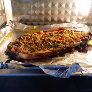 铺上炒好的蒜末 回烤箱再温5分钟(炒料没拍图 在这里说一下“油5成热 倒入蒜末和小米椒 翻炒一下加入生抽 蚝油 根据个人口味加适量的盐 然后出锅)