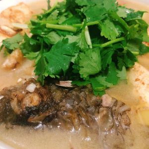 凉油下锅开始煎鱼,两面金黄色,倒入开水没过鱼,然后放入姜片和葱白,大火开后放入豆腐,放入胡椒粉和盐,熬制15分钟,然后放葱和香菜,不喜欢可以不放!