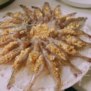 粉丝泡软平铺盘中,基围虾洗净开背摆放在粉丝上方,蒜蓉加点热油、生抽,一点点的盐,一点点的糖提鲜,ok全部准备完成,上锅蒸10分钟