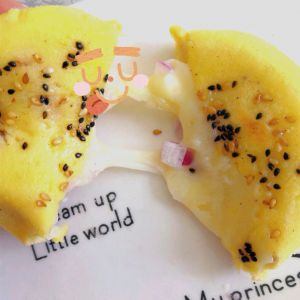 把25到30克左右的奶酪碎和火腿丁、洋葱丁混合,借助保鲜膜做成团,这样一会好包