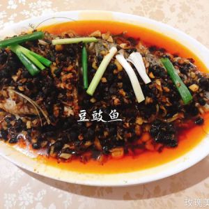 把之前打花刀码味的鲫鱼清洗一下后放入盘中,把在锅中炒香的豆豉码堆在鲫鱼身上