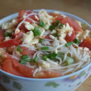 把做好的西红柿鸡蛋汤倒进过凉水后的面条,加醋,撒上葱花即可。