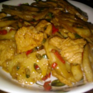 下油热锅,放莲藕,待其6成熟之后加入瘦肉一起炒。差不多熟的时候加去准备好的辣椒酱油葱,再炒急下就可以上锅啦。