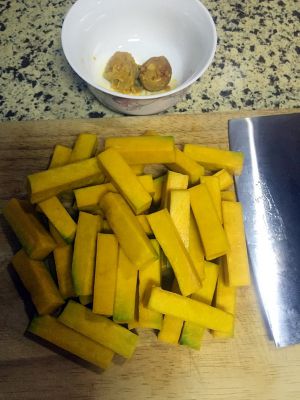 南瓜切成1cm宽4cm长的长条,把熟咸鸭蛋中的蛋黄取出备用。