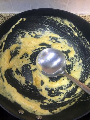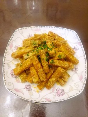 锅里留少许油,中小小迅速把咸蛋黄压碎滑散至泡沫状,倒入炸好的南瓜条,翻炒几下使南瓜条均匀地裹上咸蛋黄。