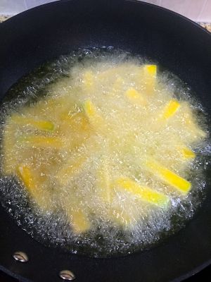 起油锅,等油烧至五六成热时,倒入南瓜条,中火炸3分钟后捞出,再开大火等油温上升到七八成热时,把炸好的南瓜条复炸一下,只需5秒,迅速捞出,这样炸出的南瓜条才会外脆里嫩。