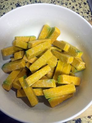 用一点点盐把南瓜稍微腌制5~10分钟,因为我觉的2个咸蛋黄的咸度不够,腌制好后撒上少许生粉,拌匀后南瓜条上能粘上薄薄一层足够了。