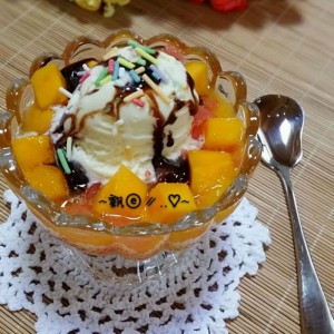 将芒果酱倒入冰淇淋碗,放入葡萄柚果肉,芒果丁,掏入冰淇淋球,淋上巧克力酱,洒上彩糖。完成。