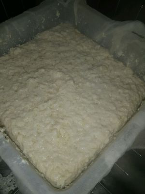 把豆腐絮倒入隔着纱布的模具,使其重新组织!没有模具用菜蓝也是一样的!