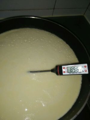 将卤水缓缓倒入豆浆,汤勺搅匀!看见出现黄色的水和豆腐絮停止搅动!