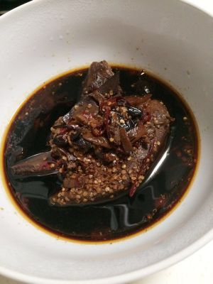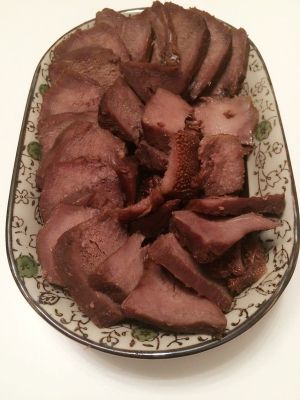 吃的时候厚切,蘸醋就好。如果做完后能放在卤水里浸泡几小时切片效果更好,更入味。