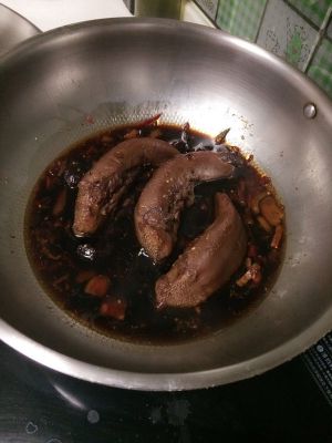 取锅,倒入半瓶卤水汁(超市有卖瓶装的卤汁)放入桂皮八角陈皮和干辣椒丝,尝一下咸淡,一般不需要再放盐,倒两勺糖。大火烧开后放入猪舌,煮一分钟转小火慢炖。