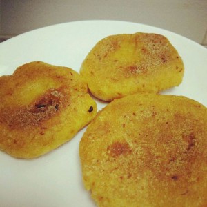 揉成小圆,然后压平,放在锅里煎一会儿,要小心糊掉