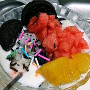 酸奶放入碗中,加糖调味,水果切成小块,加入巧克力豆等搭配,好吃有营养。