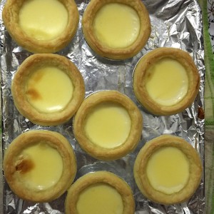 各家烤箱脾气不一样,蛋挞水表面有点微焦就可以了。