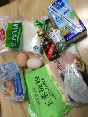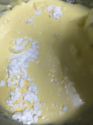 混合液中筛入玉米淀粉,打匀。之后倒入牛奶、朗姆酒、香草精,打匀。