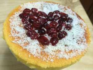 表面筛上椰蓉,用蔓越莓干拼出心形。之后冰箱冷藏更好吃哦!