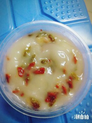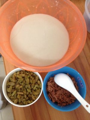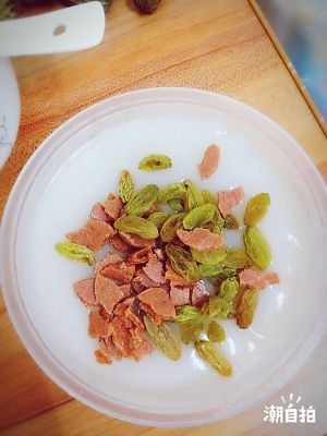 把藕粉倒入盆里,放冷水捣成水浆状态,把山楂切小块,葡萄干,备用