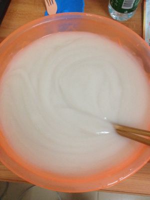 把滚烫水倒入有藕粉浆的盆里,用筷子不停搅拌,直到为黏糊状态即可