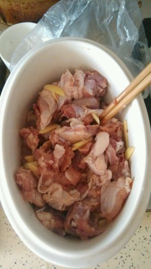 砍鸡成块!加一包盐焗粉,加少许胡椒粉,料酒,生抽,还有切丝的生姜,腌!