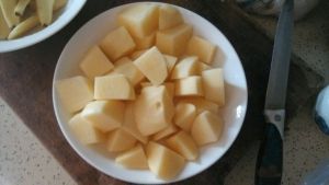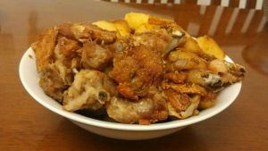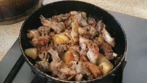 等电饭锅再次煮熟,将电饭锅的鸡,土豆包括油都搬到平底锅,开始煎,油多的话也可以炸!