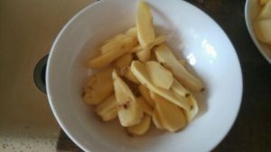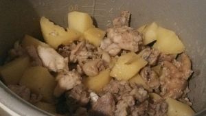 在电饭锅内倒一些花生油,让油平均分布在锅底。将生姜平铺于锅底,然后开始铺鸡块,我倾向于先铺比较好看的鸡块,带点皮的靠近锅底,然后铺一层土豆 再铺一层鸡块……