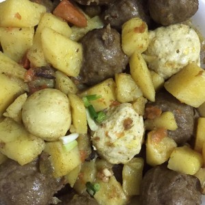 锅内热油放入土豆煸炒一会儿,放入少许盐,随后放入牛肉丸鱼丸一起煸炒,再放入咖喱酱一起炒匀,最后放入水没过土豆和牛肉丸,中火焖5到10分钟,最后收汁起锅装盘,撒入少许葱花就OK了。