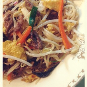 热锅下油先入香菇炒至香味后再入牛肉丝炒至变色后把其它材料一起入锅炒制,加少许盐、鸡精、然后加入备用的面条一同炒制,再加入适量味极鲜酱油提色,最后加入豆芽,出锅前加少量味精或者可不加,撒上葱段,全依个人喜好。