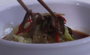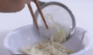 用胡椒粉和酱油调味,把鳝丝和汤汁淋在面条上,撒葱花,并将生菜烫熟后放在面条上即可。