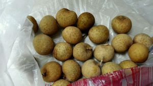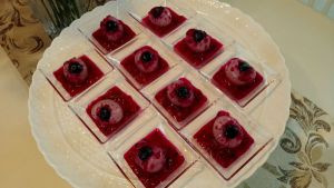 把蓝莓装进龙眼里面,不要塞进去哦,嵌着就可以了,装盘后再撒上红心火龙果泥就可以了。