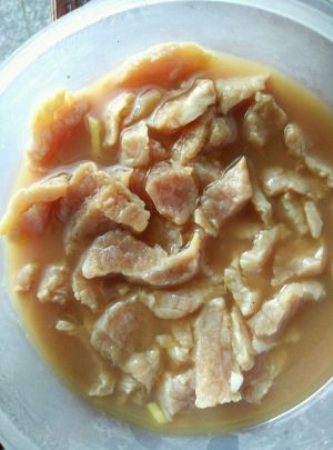 肉片加适量食盐生姜丝,搅拌均匀,倒入料酒,淹没肉片,腌制十分钟至半小时