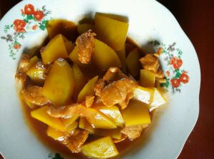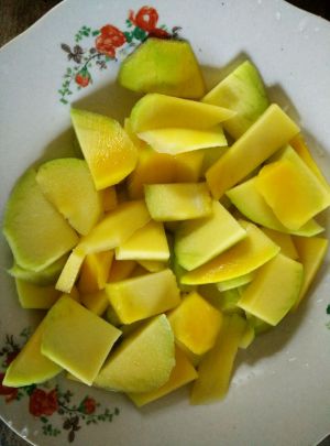 锅内倒适量油,倒入肉片,加少量酱油和水,大火炒煮,肉片变色后,倒入淡黄色芒果果片,煮至芒果片变金黄,加糖,酸甜口味适中,出锅